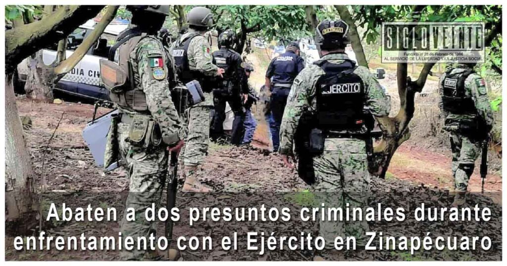 Elementos del Ejército Mexicano se enfrentaron a integrantes de un grupo criminal en una zona serrana de este municipio, hecho que dejó como saldo dos presuntos delincuentes abatidos y el aseguramiento de un campamento vinculado con actividades delictivas, informaron fuentes cercanas a las autoridades.