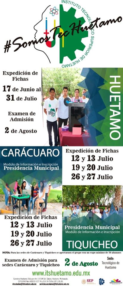 El Instituto Tecnológico Superior de Huetamo (ITSH), dio a conocer en días pasados la convocatoria para la entrega de fichas para el examen de admisión para el ingreso en las 4 ingenierías en las nuevas extensiones en los municipios de Carácuaro y Tiquicheo, además para sus instalaciones en Huetamo.