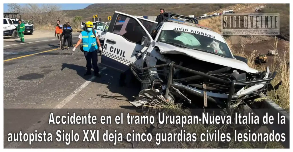 Cinco integrantes de la Guardia Civil resultaron lesionados la mañana de este lunes tras un choque frontal ocurrido en la autopista Autopista Siglo XXI, en el tramo Uruapan-Nueva Italia.