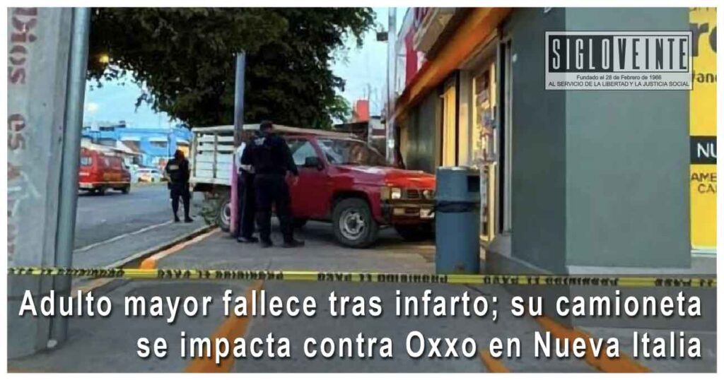 Un adulto mayor perdió la vida luego de sufrir un aparente infarto mientras conducía su camioneta, la cual terminó impactada contra la fachada de una tienda Oxxo en la colonia Libertad de la ciudaa de Nueva Italia.