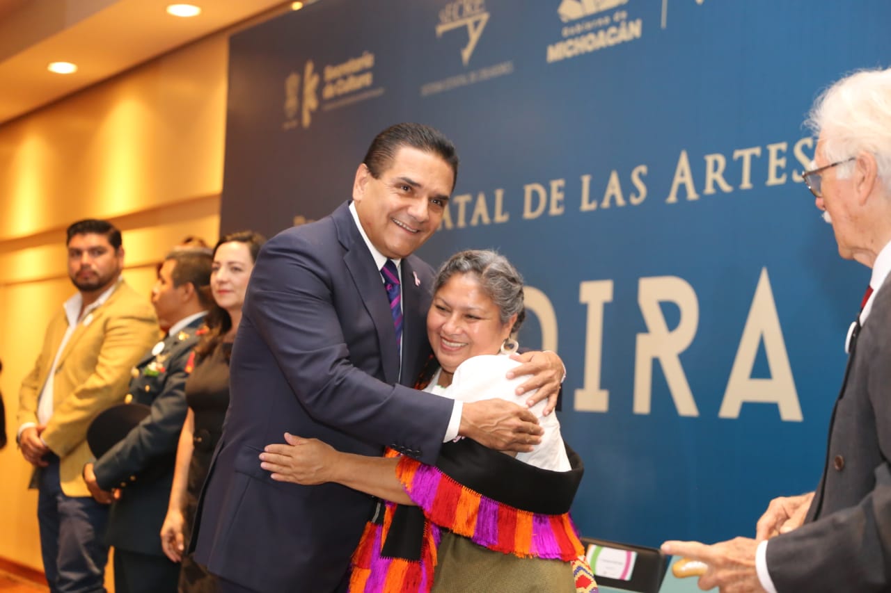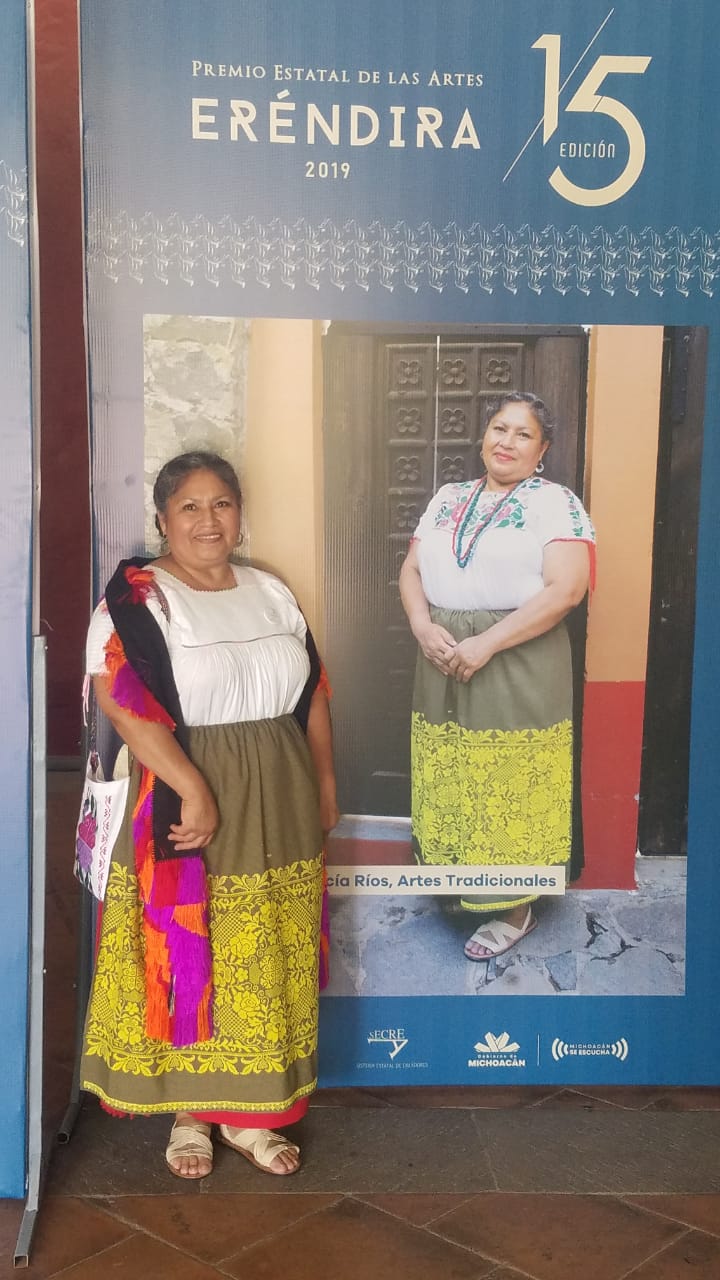 Entre los galardonados este año, figura María Guadalupe García Ríos, originaria de Comburindio, municipio de Huetamo, quién en el campo de Artes Tradicionales, recibió un estímulo económico y un reconocimiento por parte del gobernador del estado Silvano Aureoles, la mañana de jueves en Casa de Gobierno de Morelia.