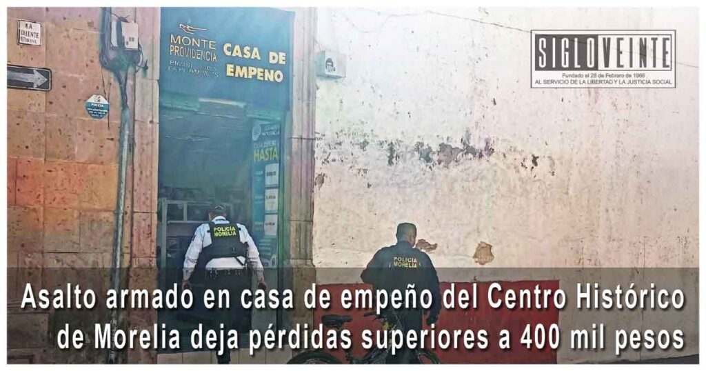 La mañana de este sábado se registró un robo con violencia en una casa de empeño ubicada en el Centro Histórico de Morelia, donde dos individuos armados lograron sustraer joyería y diversos artículos de valor, con un monto estimado superior a los 400 mil pesos.