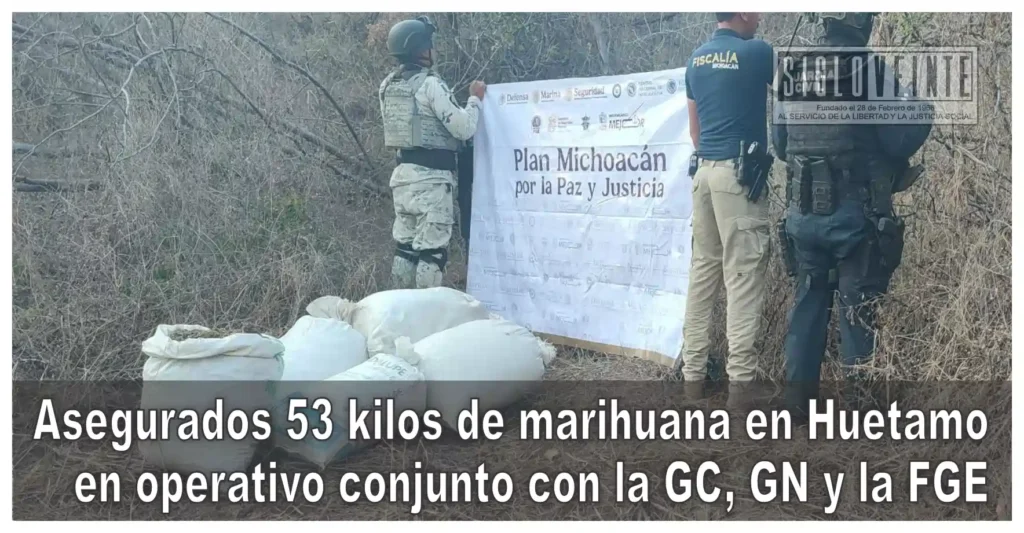 Como resultado de un operativo interinstitucional, elementos de la Secretaría de Seguridad Pública (SSP) en coordinación con la Guardia Nacional (GN) y la Fiscalía General del Estado (FGE), aseguraron aproximadamente 53 kilogramos de hierba verde seca con características propias de la marihuana, en Huetamo.
