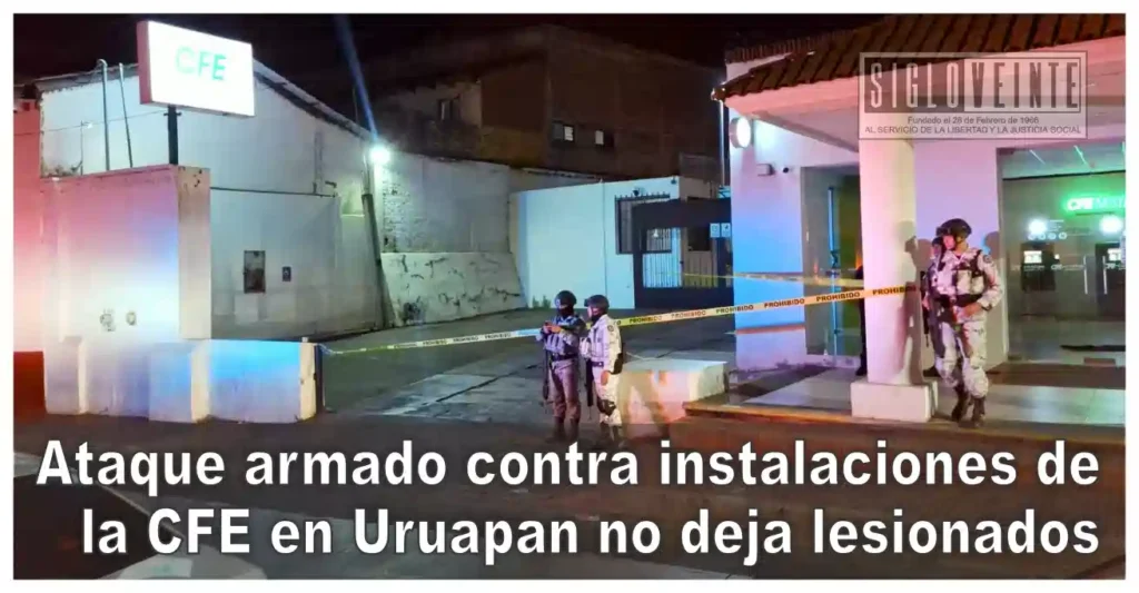 La noche de este lunes se registró un ataque a balazos en las instalaciones de la Comisión Federal de Electricidad (CFE), ubicadas sobre la calle Cupatitzio, en la colonia del mismo nombre, sin que se reportaran personas heridas.