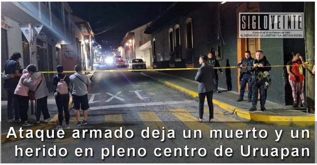 Un hombre sin vida y otro más lesionado fue el saldo de un ataque armado perpetrado la noche de este martes en pleno centro de Uruapan. Los agresores, que se desplazaban en una motocicleta, abrieron fuego contra sus víctimas y huyeron del lugar sin ser detenidos.