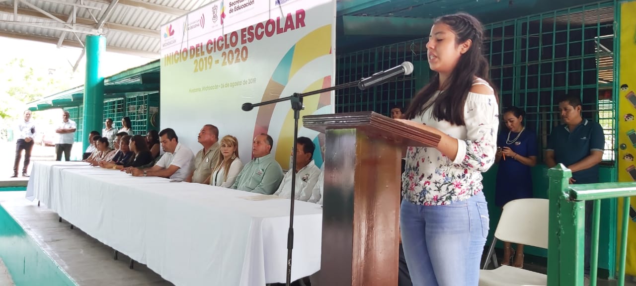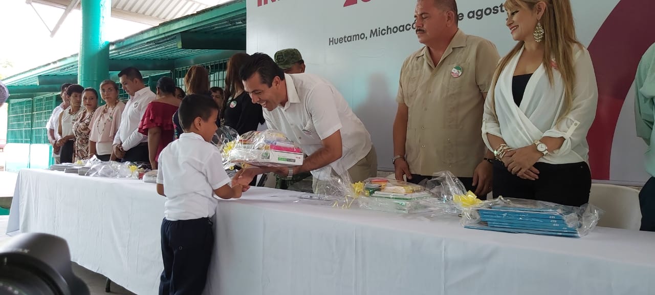 Este lunes en la Escuela Primaria 20 de Noviembre y en presencia de estudiantes de los niveles de preescolar a secundaria provenientes de diferentes comunidades del municipio, autoridades civiles y educativas encabezadas por el alcalde de Huetamo, Juan Luis García Conejo y la titular de enlace regional de la Secretaría de Educación en el Estado (SEE),Yuriem Treviño Díaz, en representación del secretario Alberto Frutis Solís; dieron inicio al ciclo escolar 2019-2020, conjuntamente realizaron la entrega simbólica de útiles escolares gratuitos.
