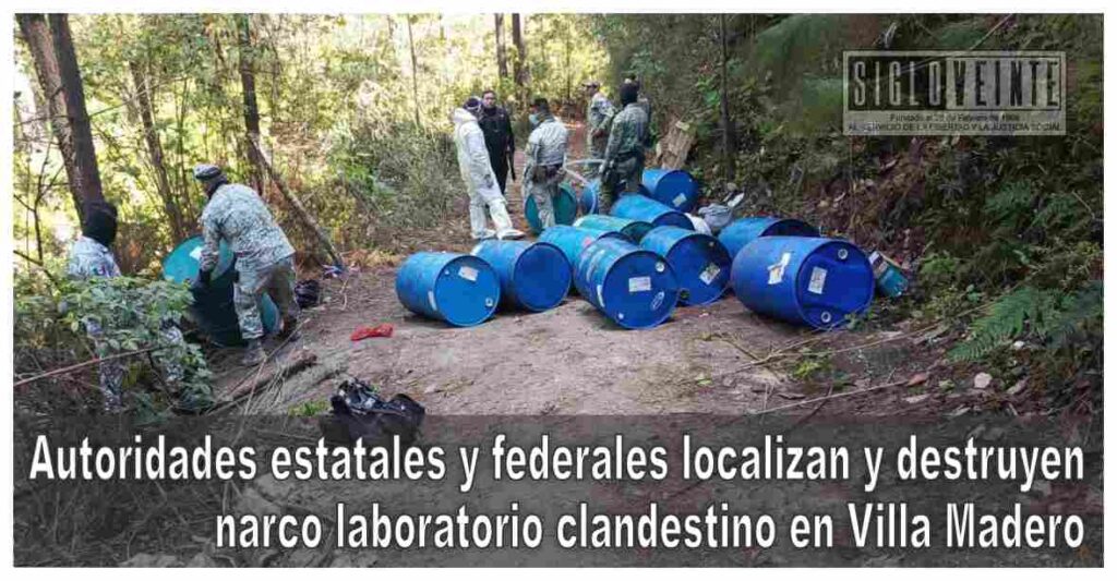 Como parte de las acciones del Plan Paricutín, elementos de las secretarías de Seguridad Pública (SSP) y de la Defensa Nacional (Defensa) localizaron y destruyeron un laboratorio clandestino para la elaboración de drogas, ubicado en el municipio de Madero.