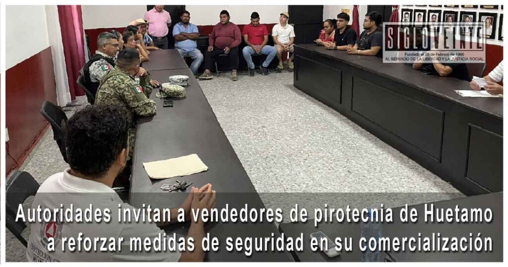 Este lunes se llevó a cabo una reunión entre autoridades de Protección Civil Municipal y Bomberos de Huetamo, en coordinación con la Secretaría de la Defensa Nacional (SEDENA), Guardia Nacional, Guardia Civil y la Dirección de Seguridad Pública, con el propósito de fortalecer las acciones preventivas en torno a la comercialización de pirotecnia en el municipio.