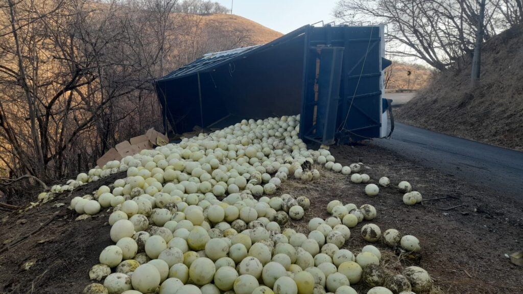 Un camión tipo torton cargado con melones protagonizó un incidente sobre la carretera federal Huetamo–Tiquicheo, a la altura del kilómetro141+600 y de la conocida curva de “La Cuesta del Mango”, sin que se reportaran personas lesionadas.