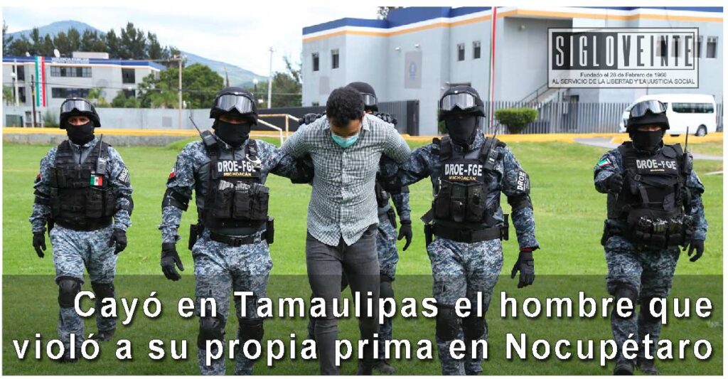 La Fiscalía General del Estado de Michoacán (FGE), con apoyo de la Fiscalía General del Estado de Tamaulipas, detuvo en aquella entidad a Pedro “N”, presunto responsable del delito de violación, cometido en agravio de su prima, de 53 años, en el municipio de Nocupétaro.