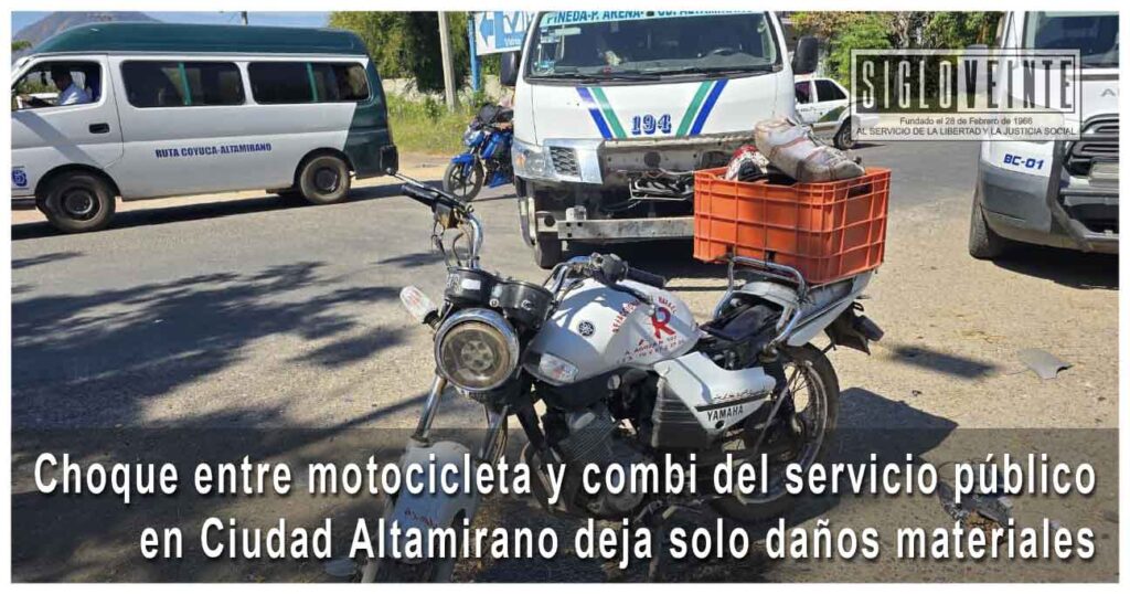 La tarde de este jueves se registró un accidente vehicular sobre el bulevar Altamirano–Coyuca, a la altura de la base de la Guardia Nacional, donde una motocicleta y una combi del servicio público de pasajeros que cubre la ruta Ciudad Altamirano–Paso de Arena protagonizaron un choque.
