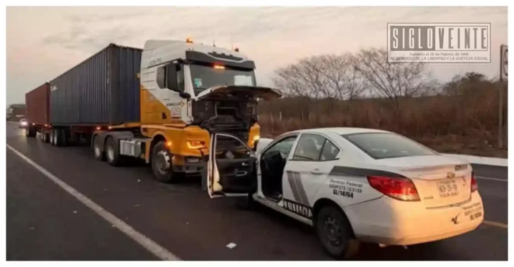 El percance ocurrió a la altura del kilómetro 282+400, en el tramo Las Cañas–Lázaro Cárdenas, cerca de la caseta de cobro de Feliciano. De acuerdo con los primeros reportes, el automóvil involucrado —un Chevrolet Aveo blanco con rotulación de empresa de seguridad privada— habría intentado realizar una maniobra de rebase, lo que derivó en el impacto directo contra un camión de carga con doble remolque.