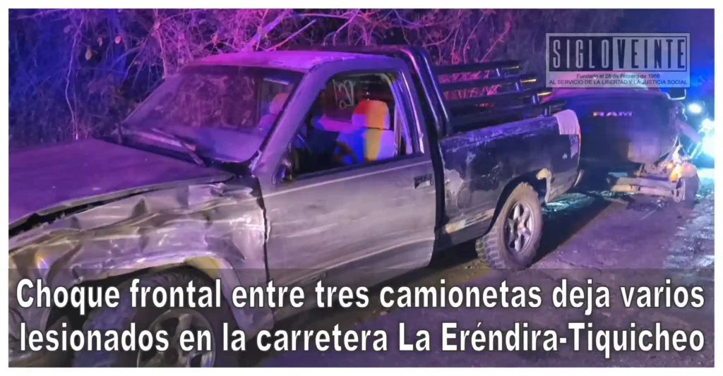 Un choque frontal entre tres camionetas se registró la noche del lunes en la carretera federal La Eréndira-Tiquicheo cerca del lugar conocido como El Potrero del municipio de Huetamo, percance que dejó personas lesionadas que fueron trasladadas a recibir atención médica, informaron autoridades de seguridad vial.