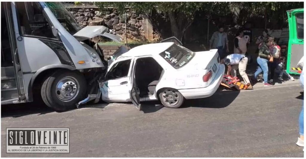 Un accidente ocurrido al mediodía de este domingo en la calzada Fray Juan de San Miguel dejó como saldo cinco personas lesionadas, luego de que un camión de la línea Colectivos de Uruapan impactara un automóvil particular y, posteriormente, colisionara de frente con un taxi.