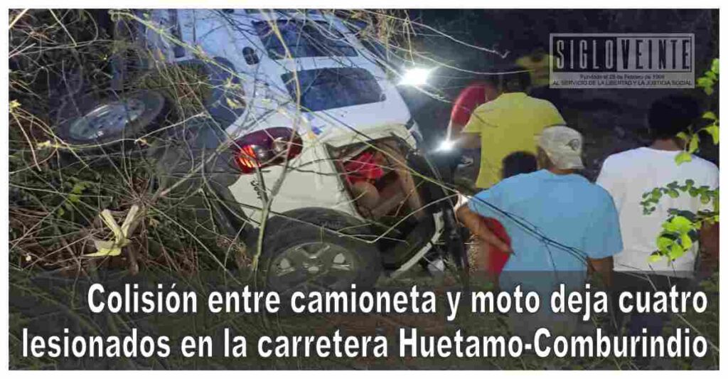 La tarde de este viernes se registró un accidente vial en la localidad de Comburindio, perteneciente al municipio de Huetamo, donde se vieron involucrados un vehículo particular y una motocicleta, con un saldo de cuatro personas lesionadas.