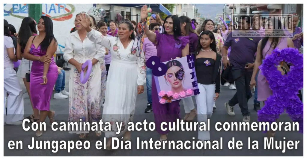 Con el lema “Mujeres unidas, fuerza imparable”, autoridades municipales y habitantes de Jungapeo conmemoraron el Día Internacional de la Mujer mediante una caminata por las principales calles del municipio y un acto sociocultural en la plaza principal.