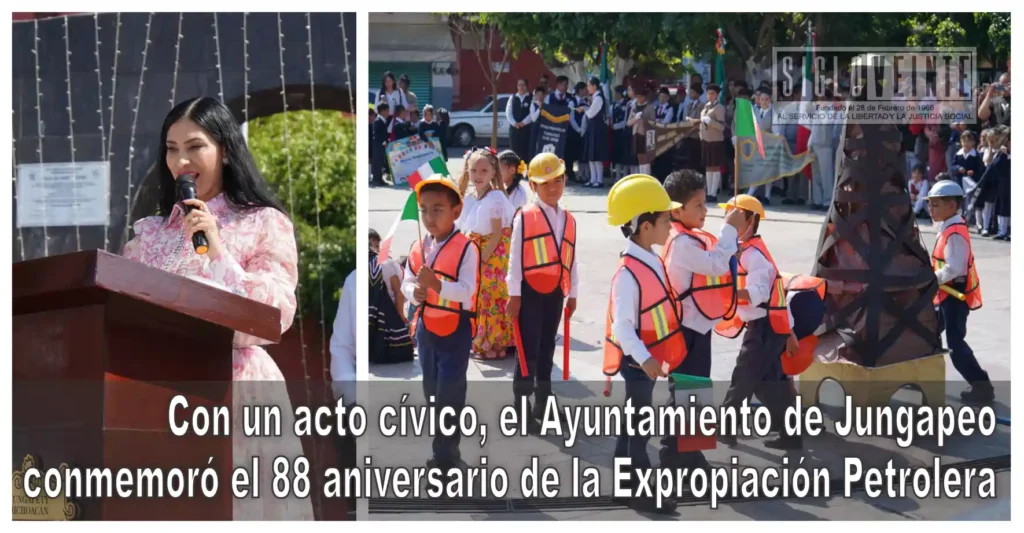 En el marco del 88 aniversario de la Expropiación Petrolera, el Ayuntamiento de Jungapeo llevó a cabo un acto cívico encabezado por la presidenta municipal Norma Angélica Yáñez Sierra, quien fungió como oradora oficial durante la ceremonia realizada en coordinación con la Zona Escolar 103 de preescolares.