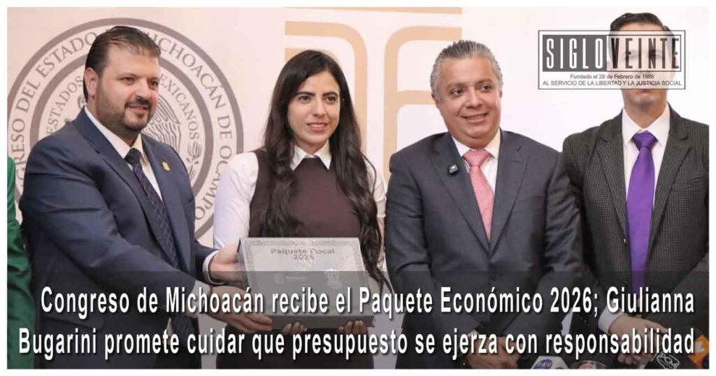 La presidenta de la Mesa Directiva del Congreso del Estado, Giulianna Bugarini Torres, al recibir el paquete económico para el ejercicio 2026, por parte del Poder Ejecutivo, adelantó que comenzarán con los trabajos de revisión y análisis para dictaminar un paquete fiscal en beneficio de las y los michoacanos.