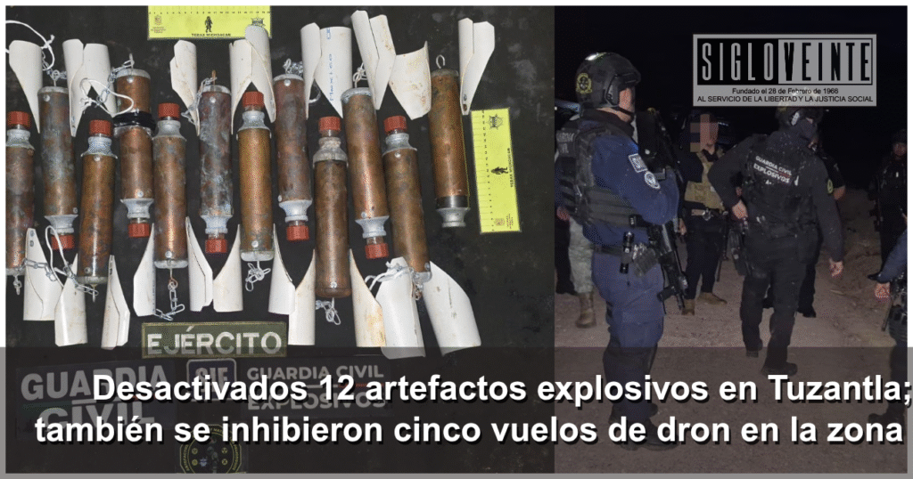 Elementos de las secretarías de Seguridad Pública (SSP) y de la Defensa Nacional (Defensa) localizaron 12 artefactos explosivos en el municipio de Tuzantla, mismos que fueron destruidos, como resultado de los trabajos encaminados a la localización y desactivación de dichos dispositivos en la entidad.