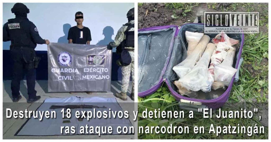 Como parte de los operativos de seguridad desplegados en la región de Tierra Caliente tras la agresión con un narcodron que dejó gravemente herido a un niño de dos años en la comunidad de Chandio, del municipio de Apatzingán, elementos del Ejército Mexicano y de la Guardia Civil localizaron y destruyeron un total de 18 artefactos explosivos improvisados, además de detener a un hombre armado.
