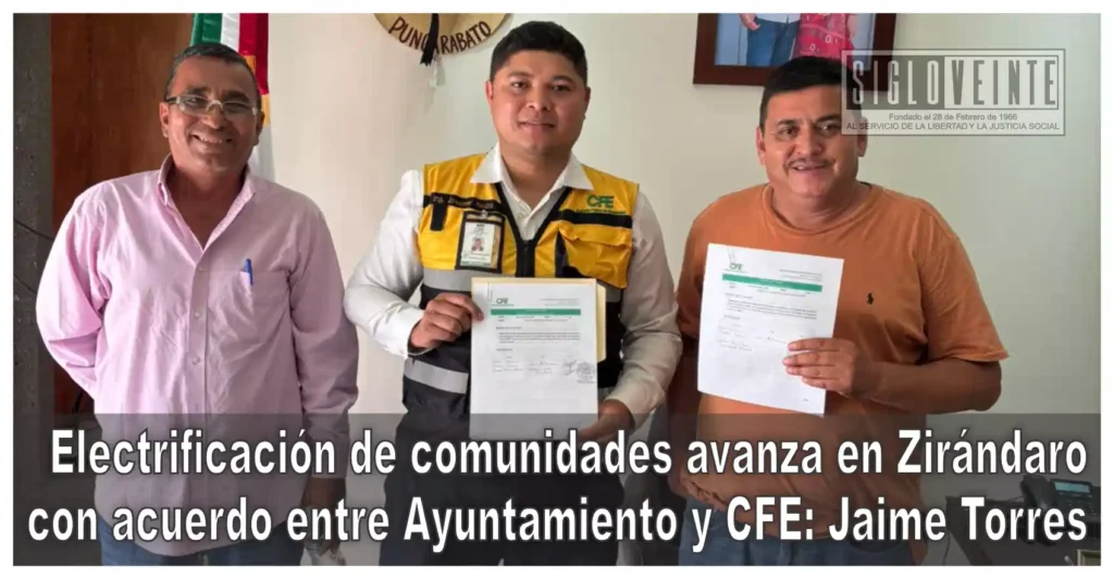 El presidente municipal de Zirándaro, Jaime Torres García, informó que este lunes se concretó la firma de una minuta de trabajo con la Comisión Federal de Electricidad (CFE), con el objetivo de avanzar en la electrificación de diversas comunidades que aún carecen del servicio.