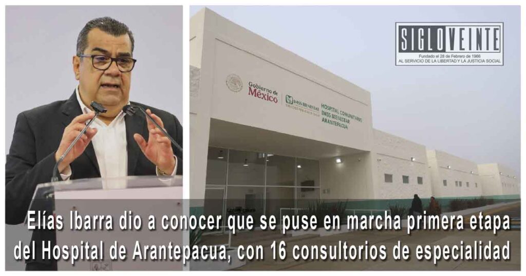 El titular de la Secretaría de Salud (SSM), Elías Ibarra Torres, informó que ya se encuentra en servicio la primera etapa del Hospital Comunitario de Arantepacua, con 16 consultorios de oftalmología, ginecología y obstetricia, traumatología y ortopedia, pediatría, medicina familiar, medicina preventiva y otorrinolaringología.