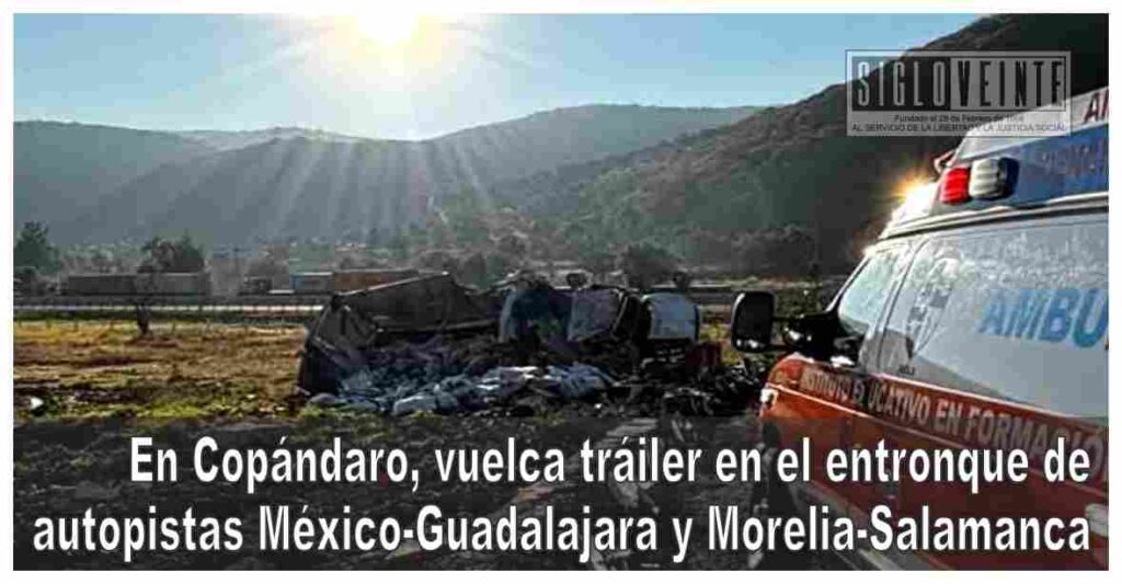 La mañana de este jueves se registró la volcadura de un tráiler en el entronque de las autopistas, dentro del municipio de Copándaro, sin que se reportaran personas lesionadas.