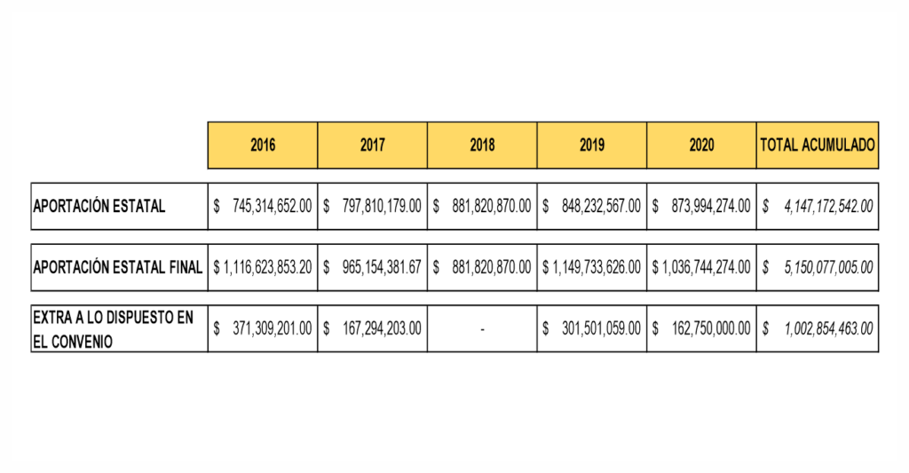 En el 2017, se entregaron 965 millones 154 mil 381 pesos; de ellos, 167 millones 294 mil 203 pesos, son recursos extraordinarios al convenio que, en ese año, fue establecido en 797 millones 810 mil 179 pesos.