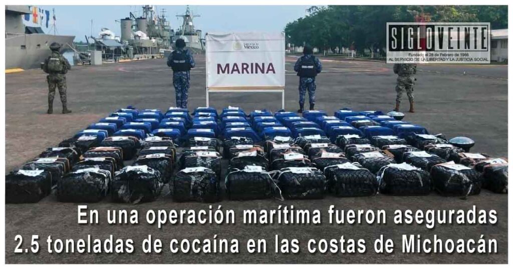 En una operación marítima encabezada por elementos de la Secretaría de Marina (Semar) a través de la Armada de México en funciones de Guardia Costera, en coordinación con la Secretaría de la Defensa Nacional (Defensa), Fiscalía General de la República (FGR), Guardia Nacional (GN) y Secretaría de Seguridad y Protección Ciudadana (SSPC), se aseguraron 87 bultos con aproximadamente 2.5 toneladas de posible cocaína en las costas de Michoacán.