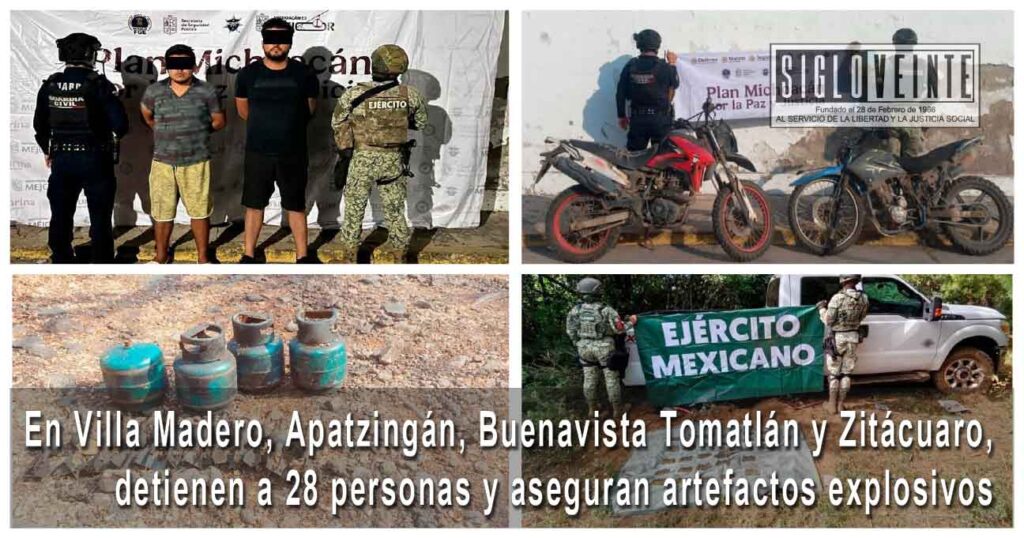 Resultado de labores del “Plan Michoacán por la Paz y la Justicia”, elementos de la Secretaría de la Defensa Nacional (Defensa), Guardia Nacional (GN), en coordinación con la Secretaría de Marina (Semar), Secretaría de Seguridad y Protección Ciudadana (SSPC) y Fiscalía General de la República (FGR), junto con Secretaría de Seguridad Pública (SSP) y Fiscalía General del Estado (FGE) detuvieron a 28 personas, aseguraron siete armas de fuego, 406 cartuchos, 27 cargadores, 18 artefactos explosivos improvisados y 21 vehículos.