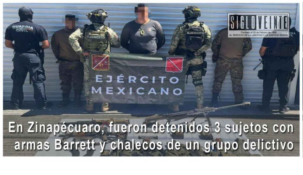 Como parte de las acciones del Gabinete de Seguridad del Gobierno de México, el pasado 14 de octubre luego del reporte de enfrentamientos en Zinapécuaro, elementos de la Secretaría de la Defensa Nacional (Defensa), detuvieron a Rafael “B”, Jorge “C” y Samuel “R”, en la comunidad de Santa Cruz, asegurándoles tres armas de fuego tipo fusil, una de ellas Barrett con cargadores y cartuchos útiles; además de cinco granadas, chalecos tácticos con las siglas CJNG y fornituras.