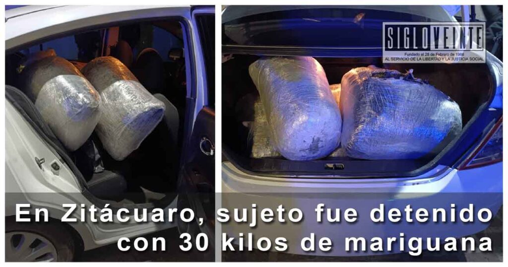Como parte del Plan Michoacán por La Paz y la Justicia, de manera coordinada, agentes de la Secretaría de Seguridad Pública (SSP) y la Policía Comunal de Crescencio Morales, detuvieron a un hombre en portación de cerca de 30 kilogramos de enervante en la ciudad de Zitácuaro.