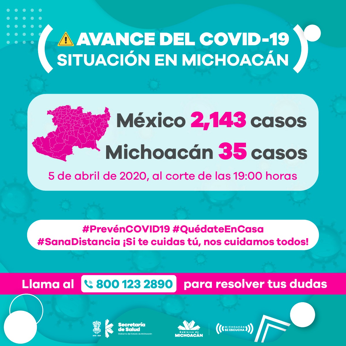 Hasta el momento son 35 casos se han confirmado en el Estado de Michoacán, VEINTIDÓS en Morelia, UNO en Zamora, DOS en Uruapan, UNO en La Piedad, UNO en Sahuayo, UNO en La Huacana, UNO en Arteaga y SEIS en Lázaro Cárdenas. Un caso fue Capturado, Muestreado y Diagnosticado en el Instituto Nacional de Ciencias Médicas y Nutrición, Salvador Zubirán.