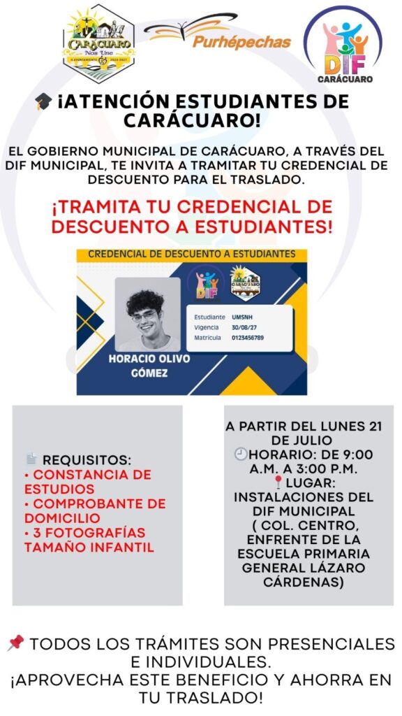 Con el objetivo de apoyar la economía de las familias y facilitar el acceso al transporte para estudiantes, el Gobierno Municipal de Carácuaro, encabezado por el presidente municipal Hever Tenory García, anunció el inicio del trámite para obtener la credencial de descuento a estudiantes, a través del Sistema DIF Municipal.