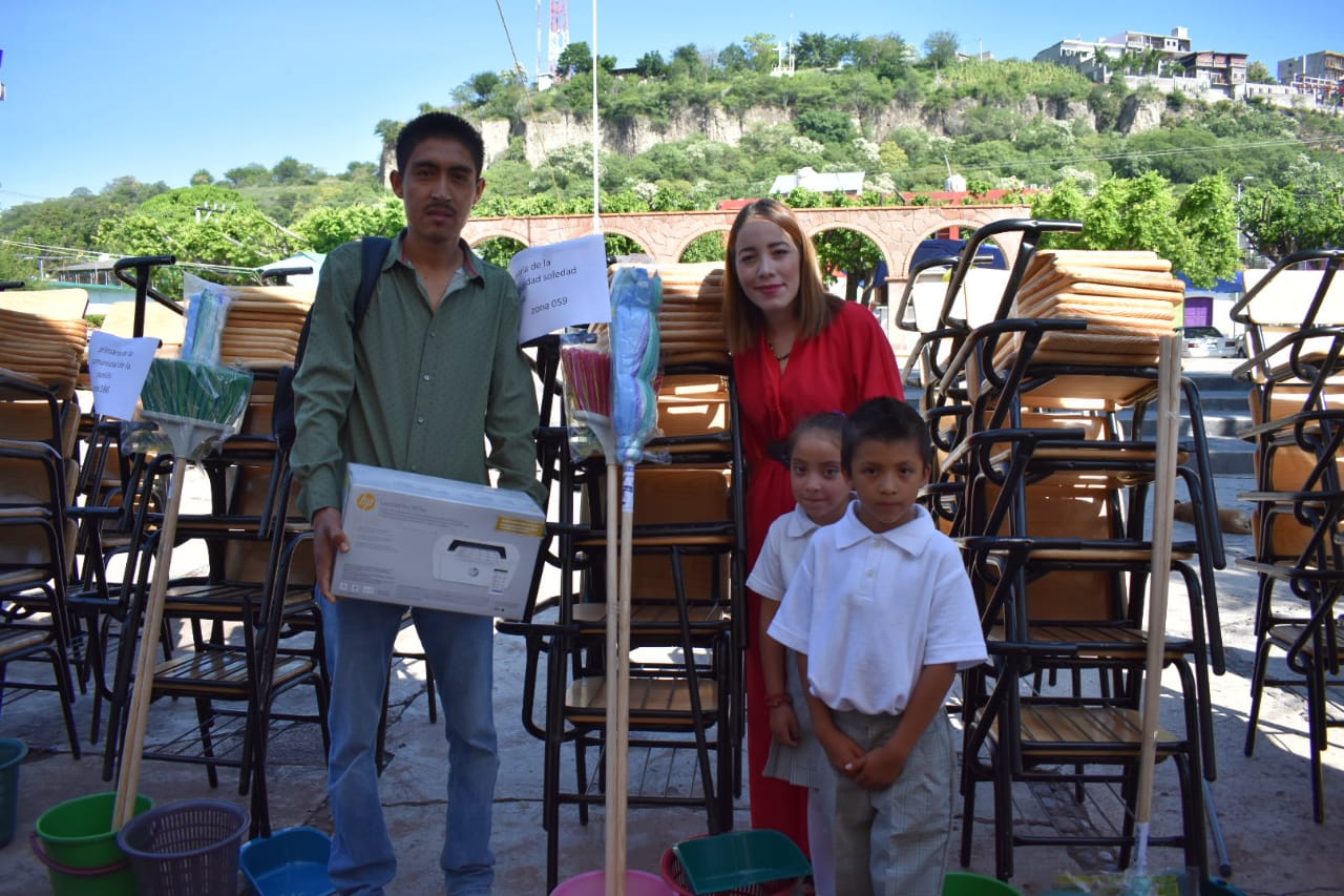 Entre los apoyos que entregó fueron butacas, escritorios, impresoras, archiveros, tableros de básquetbol, balones, productos para la limpieza, un horno, engargoladoras, bandera, bombas para noria, equipamiento para luz eléctrica, entre otros artículos.