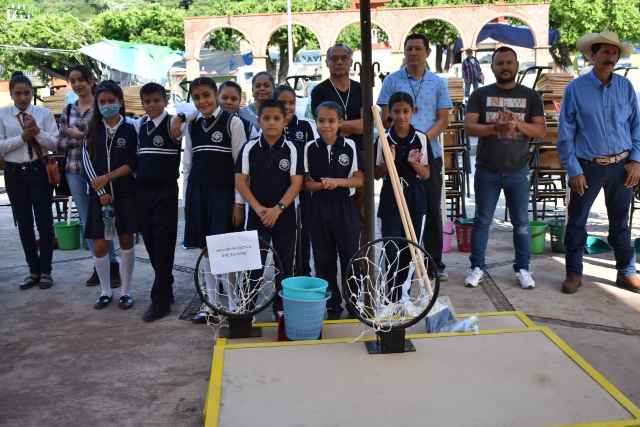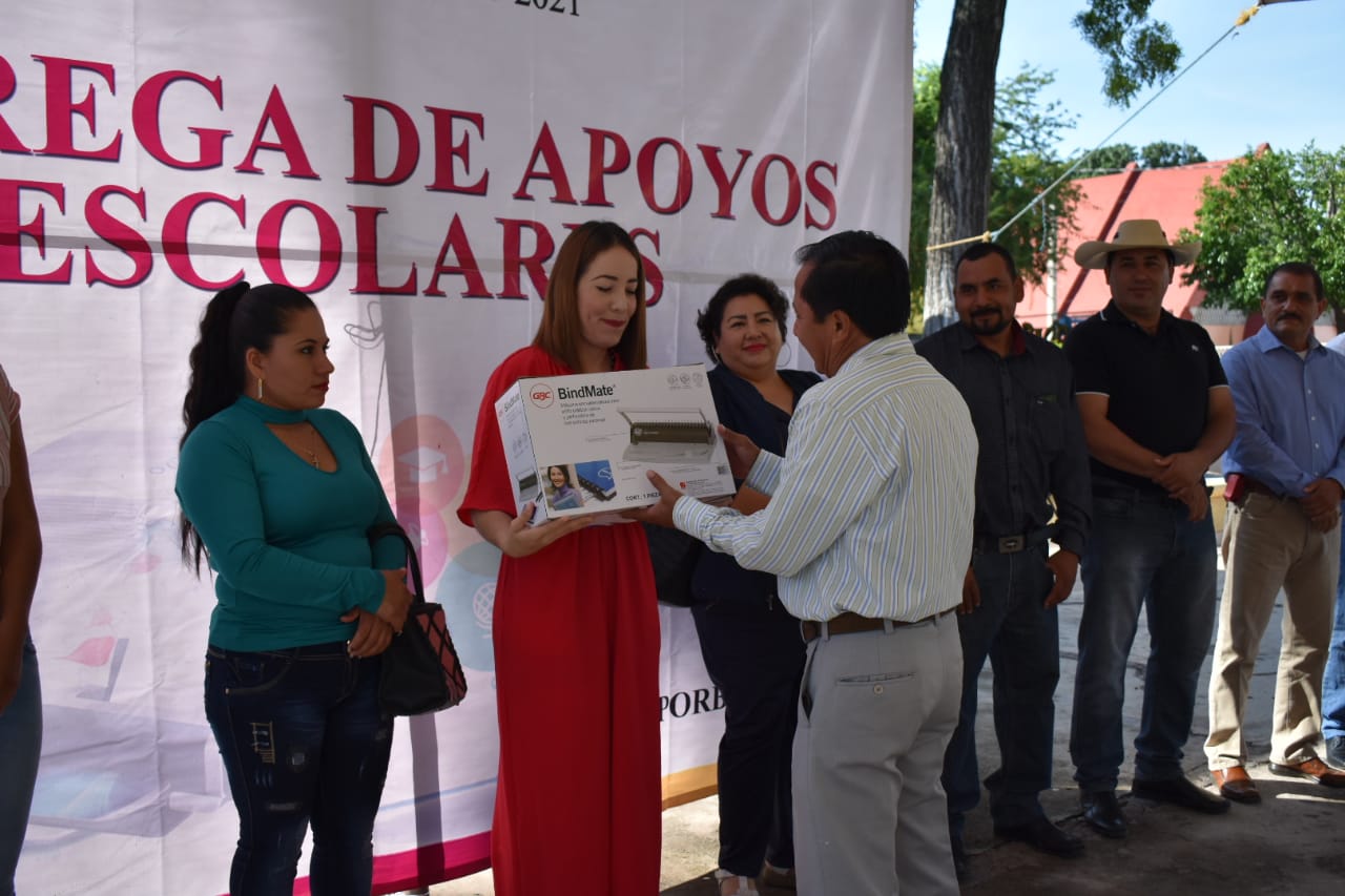 La acompañaron en esta entrega, Juan Crisóstomo Arellano Ramírez, Supervisor de la Zona 186 de Primaria; Sonia Izela Granados Ramírez, Supervisora de la Zona 09 de Telesecundarias; los regidores, Beatriz Albarrán, José Bernal Luna y María de Jesús Soto Arriaga; Edgar López, Asesor Técnico de la Zona 186; y Abiel Miranda Palomino, Asesor Técnico de la Zona 186.