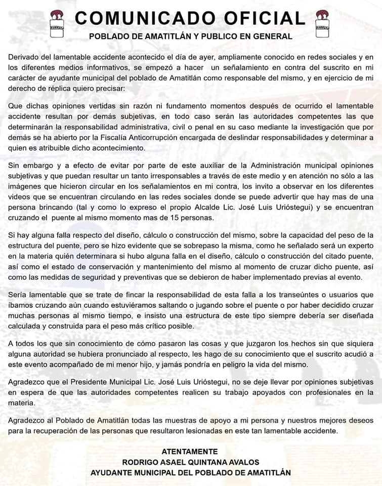 En el video que muestra el momento de la tragedia se ven a varios funcionarios columpiarse mientras pasan por el puente, luego se escuchan gritos y enseguida ocurre el desplome. Desde que los hechos ocurrieron, Quintana Ávalos señalan al hombre, quien es ayudante municipal y en respuesta emitió un comunicado para deslindarse de los hechos.