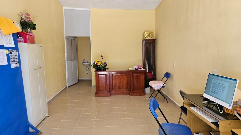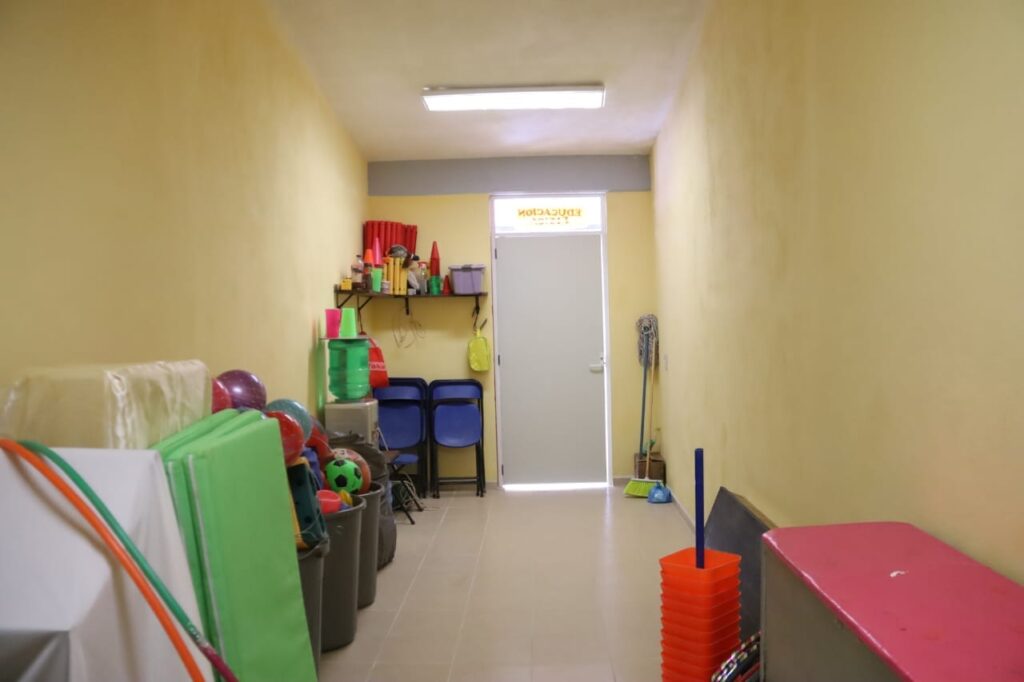 En términos de equipamiento, se llevó a cabo la instalación de la red eléctrica, se colocaron lámparas y una luminaria, así como un ventilador para mejorar la ventilación en las aulas. Además, se instalaron cancelería y protección de herrería en las ventanas y puertas, se suministró e aplicó impermeabilizante prefabricado, se colocó un tinaco con su base de herrería y se realizó el suministro de tubería para la conducción de agua, incluyendo la colocación de una bomba.