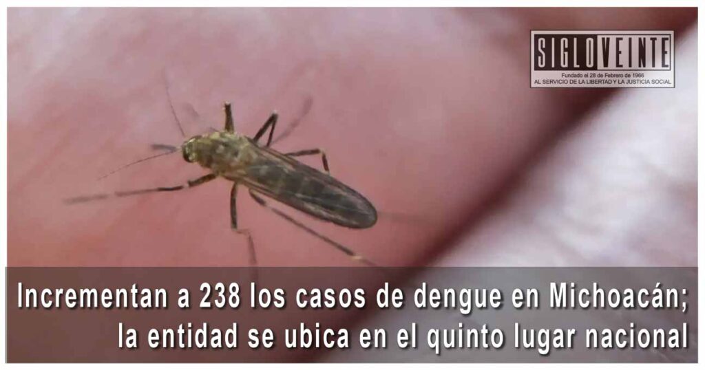La cifra de casos confirmados de dengue en Michoacán aumentó a 238, de acuerdo con el Panorama Epidemiológico de Dengue 2025 emitido por la Dirección General de Epidemiología de la Secretaría de Salud federal (Ssa). Esto representa un incremento de 31 casos en comparación con la semana pasada, cuando se habían registrado 207 contagios.