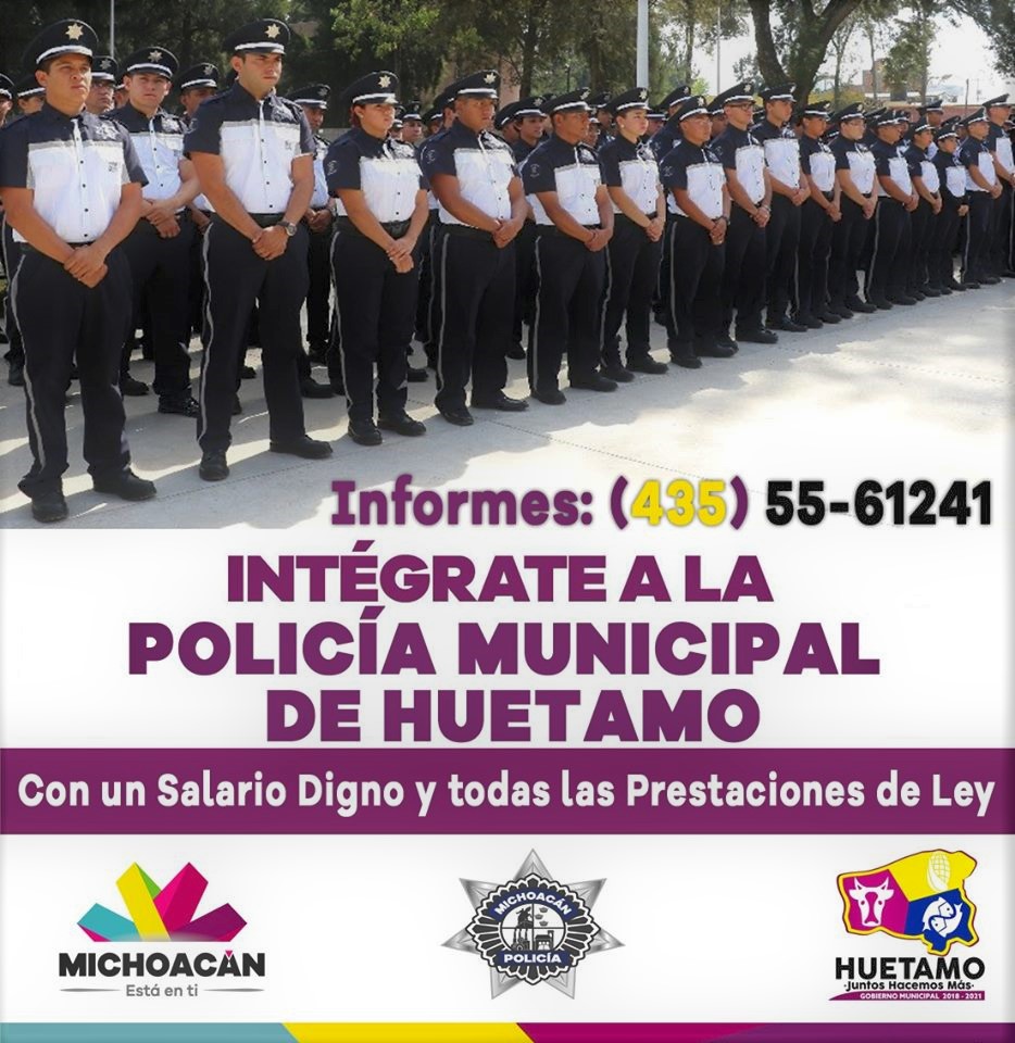 La Dirección de Seguridad Pública de Huetamo, está invitando a mujeres y hombres con vocación de servicio, responsabilidad y disciplina para conformar la Policía Municipal y así poder servir con su labor brindar condiciones de paz y tranquilidad a las y los huetamenses.