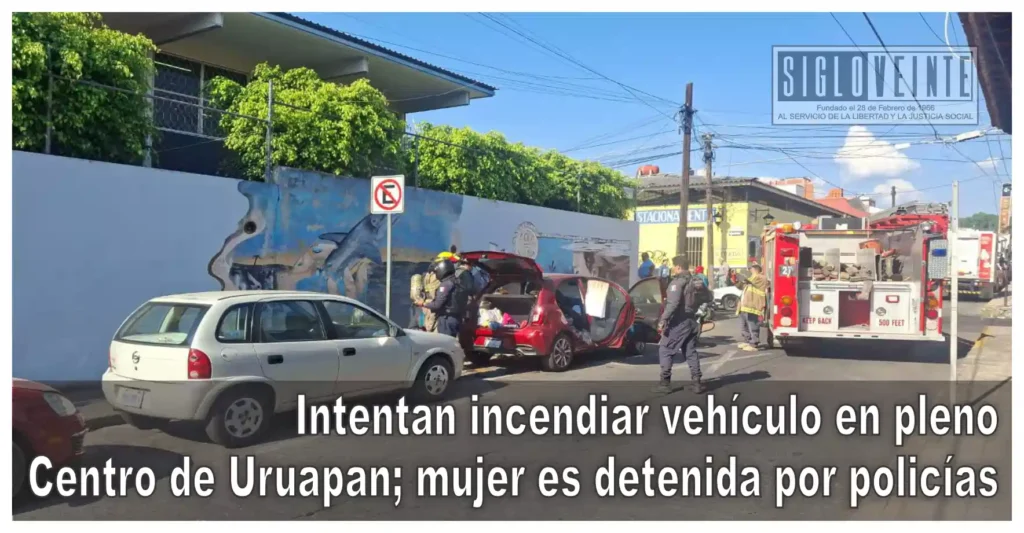 La mañana de este miércoles, una mujer fue detenida por elementos de seguridad luego de que presuntamente intentara incendiar un vehículo estacionado en calles del Centro de Uruapan. Vecinos de la zona lograron sofocar las llamas antes de que el fuego se propagara.