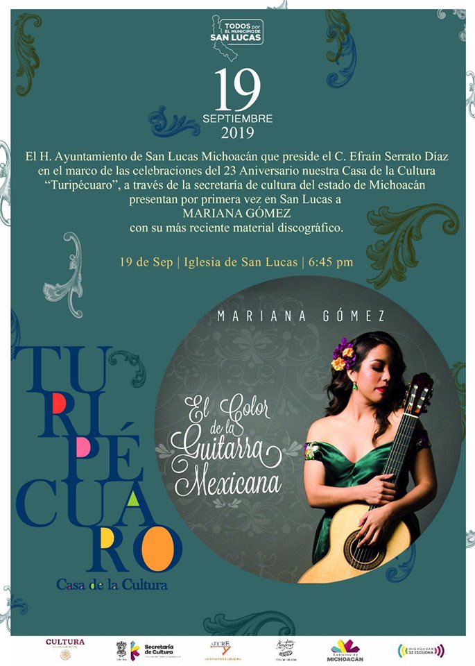 Dentro de las actividades por el 23 aniversario de la Casa de la Cultura Turipécuaro de San Lucas, el día de mañana jueves 19 de septiembre, se presentará la guitarrista Mariana Gómez, presentando su más reciente material discográfico titulado “El Color de la Guitarra Mexicana”.