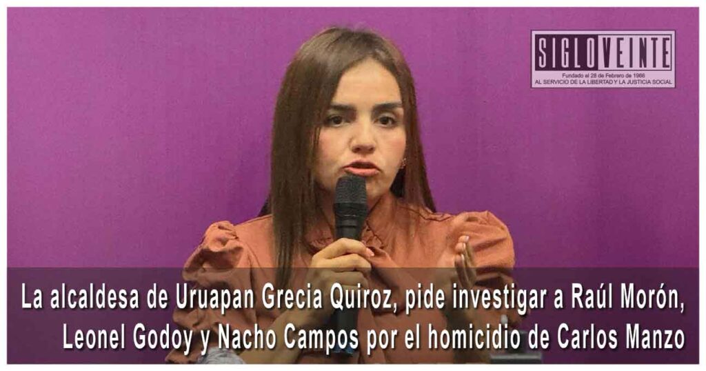 La presidenta municipal de Uruapan, Grecia Itzel Quiroz García, pidió que se investigue al senador Raúl Morón Orozco, al diputado federal Leonel Godoy Rangel y al expresidente Ignacio Benjamín Campos Equihua, quienes podrían estar detrás del homicidio de su esposo y exalcalde Carlos Alberto Manzo Rodríguez, asesinado el 1 de noviembre en el marco del Festival de Velas.