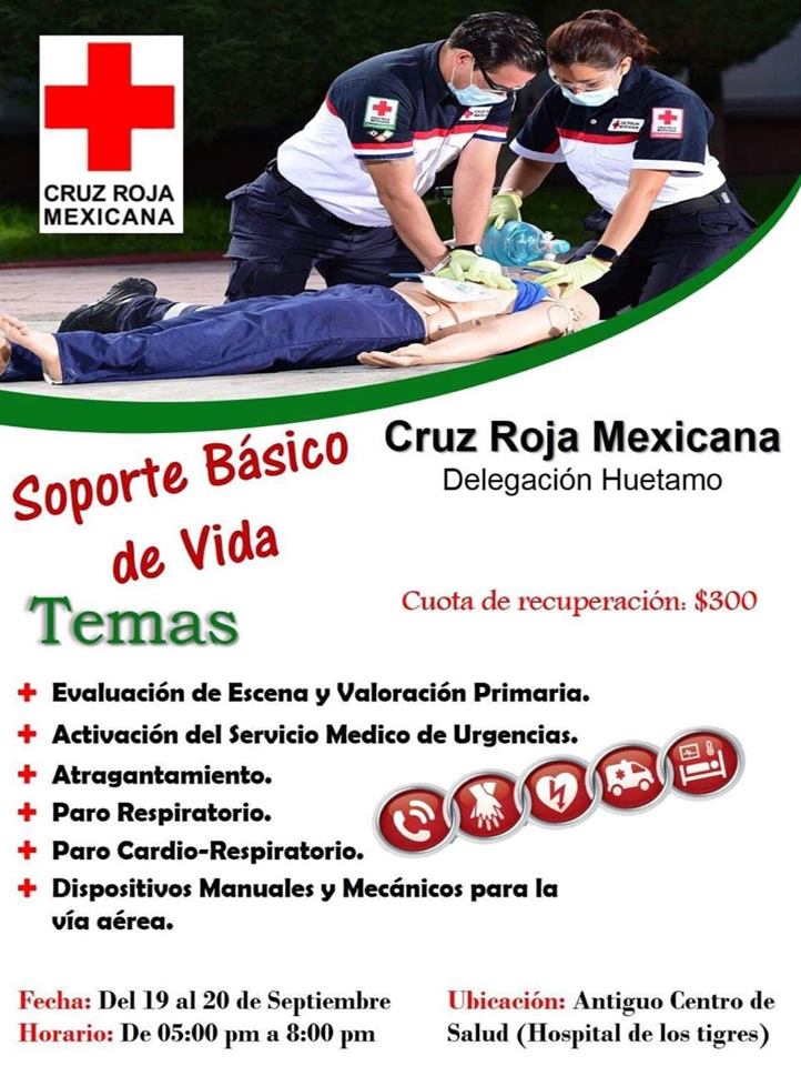 La delegación en Huetamo de la Cruz Roja Mexicana anunció una nueva convocatoria para al curso Soporte Básico de Socorrismo que ofrece la benemérita institución, el cual se desarrollará del 189 al 2 de septiembre en las instalaciones de la institución, en un horario de las 5 a las 8 la noche.