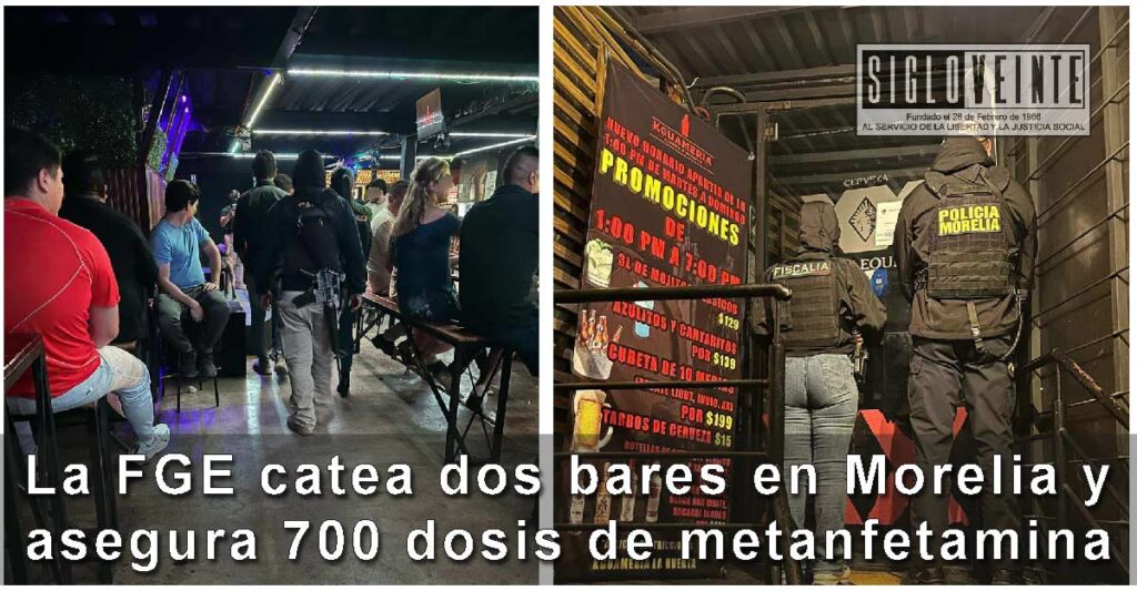 La Fiscalía General del Estado de Michoacán (FGE) ejecutó dos cateos en dos bares ubicados en Morelia, y obtuvo como resultado el aseguramiento de 700 dosis de sustancia cristalina con las características de la metanfetamina.