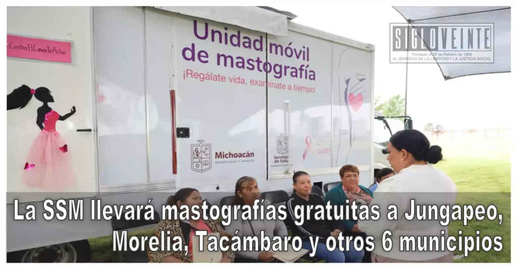 Del 9 al 13 de marzo, la Secretaría de Salud de Michoacán (SSM) llevará unidades móviles a nueve municipios del estado para realizar mastografías gratuitas a mujeres de 40 a 69 años, como parte de las acciones para la detección oportuna de cáncer de mama.