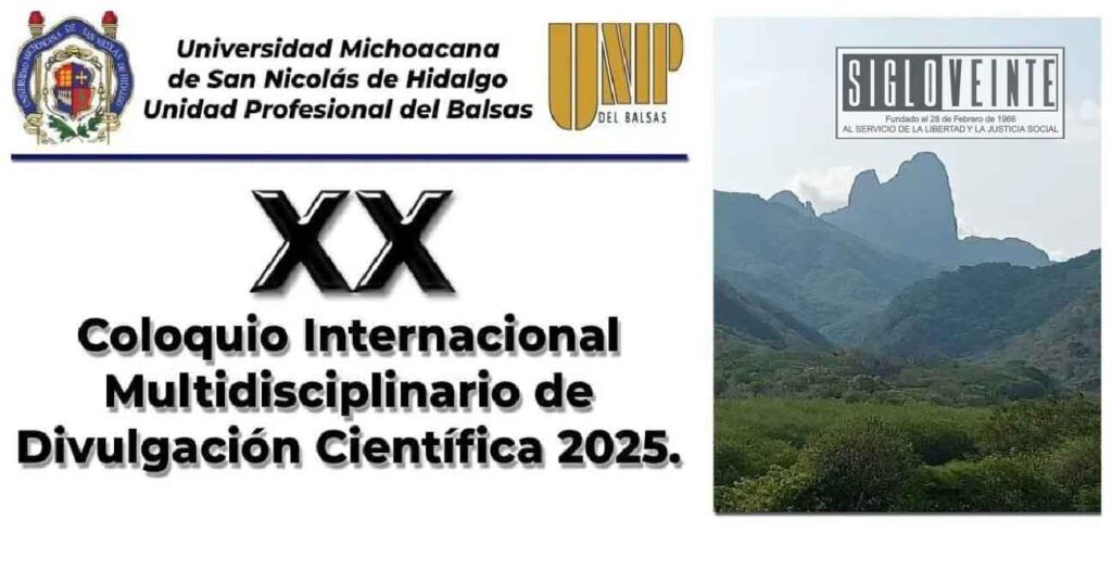 Refrendando su compromiso con la formación integral, la investigación científica y la vinculación social, la Universidad Michoacana de San Nicolás de Hidalgo (UMSNH) a través de la Secretaría Académica y la Unidad Profesional del Balsas, convoca al XX Coloquio Internacional Multidisciplinario de Divulgación Científica, un espacio propicio para la divulgación del conocimiento científico y el intercambio de resultados de investigación, que se llevará a cabo de manera presencial del 24 al 27 de noviembre en las instalaciones de dicho plantel, ubicado en el municipio de Huetamo.