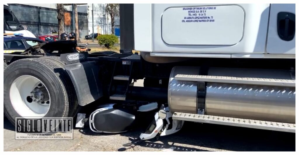 Un motociclista se salvo de milagro después de derrapar en su unidad y quedar accidentalmente abajo de un tractocamión.