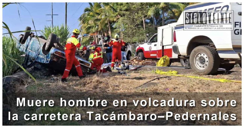 Un hombre perdió la vida la mañana de este viernes tras la volcadura de una camioneta sobre la carretera Tacámbaro–Pedernales, a la altura del balneario Arroyo Frío.