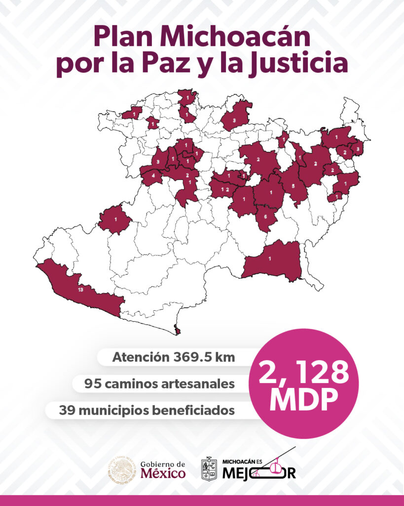 Como parte del Plan Michoacán por la Paz y la Justicia, el Gobierno de México destinará una inversión superior a los 2,297 millones de pesos para la construcción de 95 caminos artesanales en diversas regiones del estado, con el objetivo de fortalecer la conectividad regional y mejorar las condiciones de movilidad en comunidades rurales.